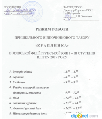 Режим роботи пришкільного відпочинкового табору "Краплинка"